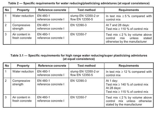 EN934-2 Table 3.1 — Specific requirements for high range water reducing/super plasticizing admixtures (at equal consistence)