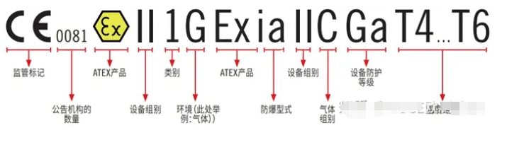 (4)防爆標(biāo)志,ATEX防爆標(biāo)志比IECEx認(rèn)證標(biāo)志復(fù)雜些,可以看下我們舉的例子就清楚了,
